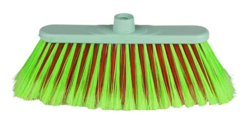 Vassoura com capa em resina virgem e fios plumados duplamente estabilizados que permitem mais maciez na varrição e durabilidade da vassoura.